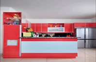 Layout pantry berukuran 4 m x 3 m ini sesungguhnya sangat sederhana. Pembagian kerja area\ (zoning) dilakukan\ dengan tepat, sehingga memudahkan aktifitas penggunanya. Zoning pada pantry dimulai dengan\ penempatan\ peralatan yang mendukung aktivitas di dapur. Penyimpanan bahan makanan yang diwakili oleh lemari es bersanding dengan area untuk proses persiapan yang diwakili oleh kitchen sink. Selanjutnya, terdapat area untuk proses memasak yang diwakili oleh kompor, serta\ sebuah mini bar pada sisi yang lain Desain yang pintar termasuk dalam hal penampilan pantry. Warna merah dominan dengan finishing mengilat, membuat pantry ini sangat eye catching. Kilap pada permukaan warna merah dapat memantulkan cahaya dan sedikit warna lain pada benda-benda di hadapannya. Seluruh kabinet dan lacinya terbuat dari plywood (kayu lapis), dengan finishing HPL Glossy (high pressure laminate), sehingga warna merah pada kabinet nampak mewah dan mengilat. Untuk mengurangi kesan masif dan monoton dari dominasi warna merah, terdapat lis-lis pembagi kabinet yang terbuat dari material aluminium. Penggunaan material ini berulang pada beberapa kabinet, sehingga tampilan kabinet pantry tampak dinamis. Adapun untuk table top, digunakan mate- rial granit dengan corak dan warna abu-abu, yang memberi tampilan enada dengan warna pantry secara keseluruhan. Sedangkan sebagai back splash atau penutup dinding pantry, dipilih material berbeda-beda sesuai dengan penempatannya. Ada yang menggunakan material black mirror, granit dan juga stainless steel. Dari sisi desain kabinet, pantry ini juga mengusung konsep yang kompak. Selain berfungsi sebagai area penyimpanan perangkat memasak, alat-alat makan, ataupun masakan yang siap dihidangkan, kabinet juga difungsikan untuk menyimpan appliances. Desain ini membuat pantry terlihat rapi dan lapang, sehingga makin membuat nyaman penggunanya.