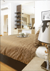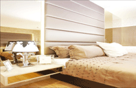 Anda juga bisa mencoba memakai stiker motif bunga atau motif ukiran lengkung pada cermin besar yang ada di kamar. Selain itu stiker ini mudah untuk diaplikasi dan dilepas pada saat Anda bosan. Untuk menambah kesan chic, pakailah spot light pada daerah yang perlu ditekankan dan juga buat hidden lamp di beberapa tempat. Seperti pada kamar tidur berikut, yang menggunakan hidden lamp pada belakang backdrop ranjang yang semakin menambah suasana hangat dan manis pada ruangan.
