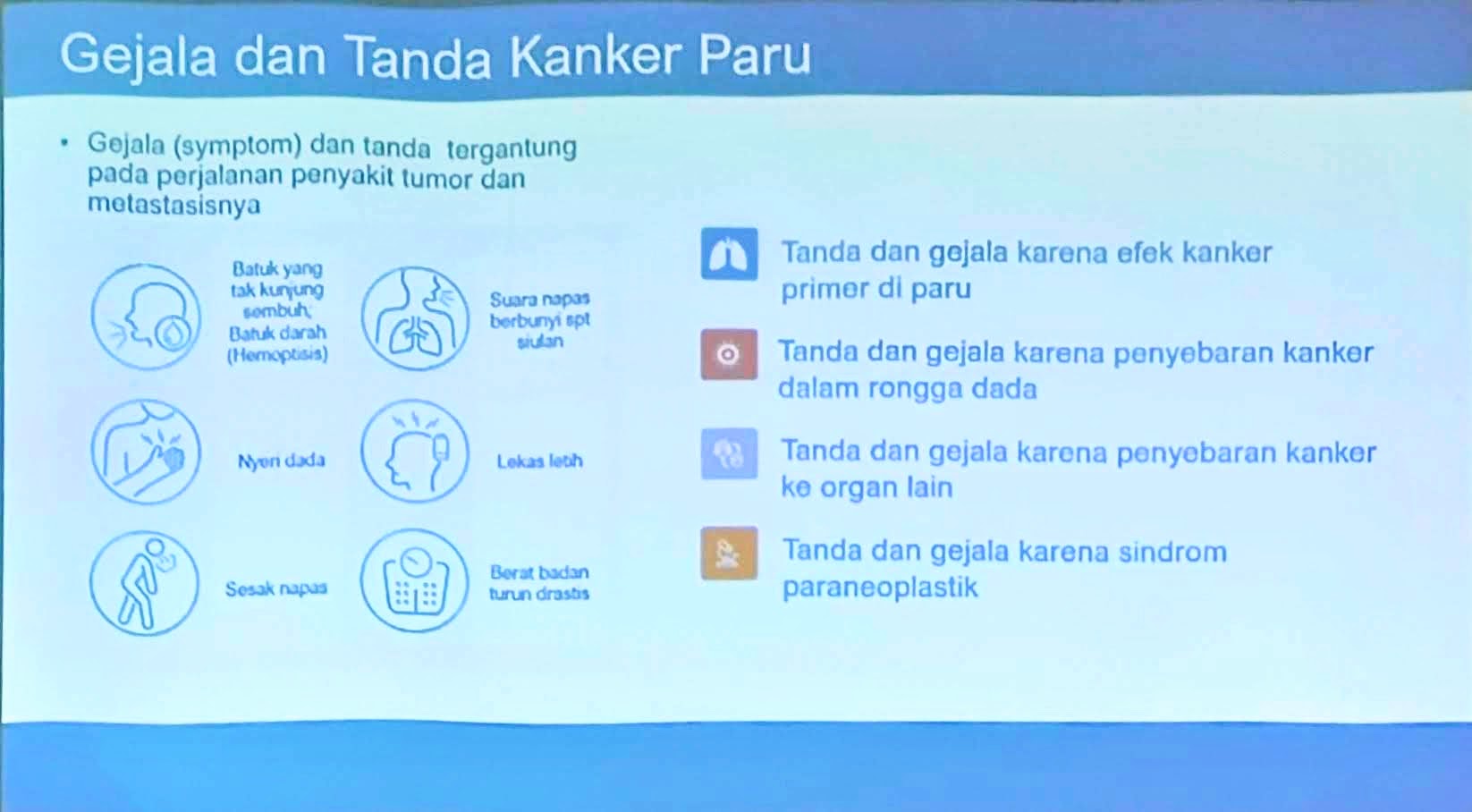 “Tanda dan gejala respirasi akibat efek kanker primer di paru adalah batuk yang tak kunjung sembuh, batuk darah, sesak napas, nyeri dada. Sementara tanda dan gejala karena penyebaran kanker dalam rongga dada adalah nafsu makan menurun, berat badan turun drastis, nyeri menelan, pembengkakan pada wajah dan lengan, suara serak, suara batuk melemah, nyeri dada pleuritik, kelopak mata menurun, pupil mata mengecil, berkurangnya keringat pada wajah, hingga nyeri bahu dan penyusutan otot di bahu dan lengan,” jelas Prof. Elisna.
