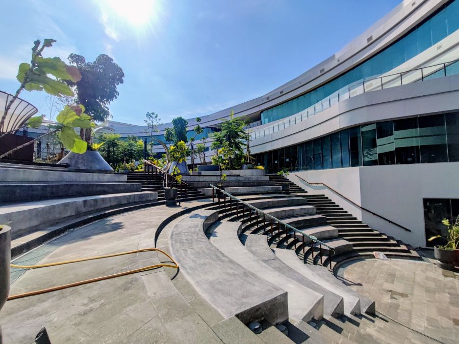 Ruang terbuka ini dilengkapi tangga-tangga berundak ergonomis membentuk amfiteater alami, mengundang orang untuk duduk santai, berbincang atau sekadar berhenti sejenak. Efeknya terasa langsung— pengunjung tidak lagi merasa berada di dalam pusat perbelanjaan, melainkan di ruang publik yang hidup.