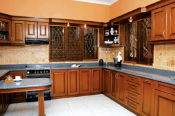 interior seperti art work, lampu dan perabot, yang semuanya dipadu menjadi satu kesatuan yang harmonis. Sentuhan eklektik tidak hanya sebagai perpaduan antara modern dan tradisional, namun bisa merupakan aplikasi dari gaya klasik yang senantiasa abadi.Di dalam rumah yang memiliki tatanan ruang split level ini, hampir seluruh lantainya ditutup lapisan karpet serta wallpaper pada dindingnya. Ruang-ruang utama yang berfungsi untuk santai seperti ruang keluarga, ruang duduk, ruang tamu dan ruang makan, seluruh lantainya dilapis karpet warna merah. Sementara untuk lapisan dindingnya, dipilih wallpaper warna senada. Kondisi ini membuat ruangan nampak lebih gelap. Suasana temaram agaknya merupakan suatu langkah yang sengaja Opa Aras lakukan, untuk menimbulkan kesan romantis ruangan. Nyala lampu-lampu dinding makin mempertegas hal tersebut.