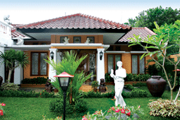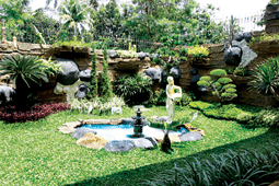 lansekap. Taman yang begitu luas di halaman depan dan belakang, dihiasi beberapa patung orang bergaya Eropa warna putih. Ornamen patung dengan sosok wanita dan anak kecil ini seakan menunjukkan eksistensi rumah ini.Dari sisi arsitektural, rumah dikemas dengan tetap mengutamakan unsur tropis lewat atap segitiga di rumah utama. Sementara sentuhan Eropa dihadirkan pada penutup area carport. Berbentuk atap dak beton, yang juga berfungsi sebagai balkon.