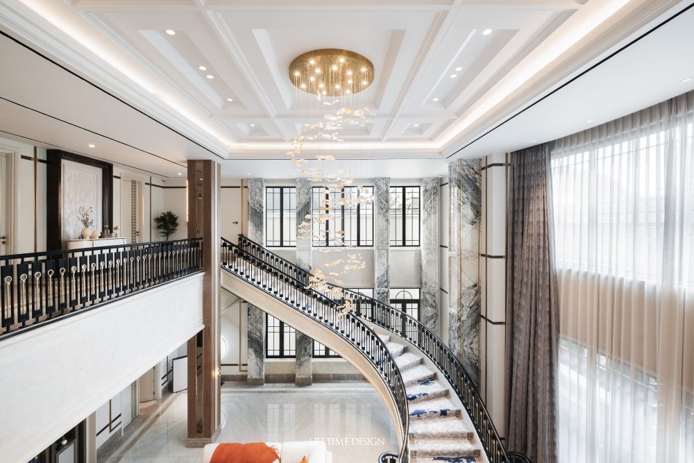 Pengolahan ruang dalam dirasakan mengalir, lapang dan terang. Pembagian ruang antara area publik dan privat terasa seimbang, dengan zoning ruang yang elegan. Di area living room lantai satu, kehadiran void tinggi menghadirkan suasana grand dan berkelas, didukung tangga melingkar yang ikonik dengan railing custom bak istana.
