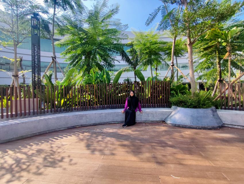 Penulis menikmati forest inner court dengan suasana area yang rimbun. Berada di area ini, yang dirasakan bukan sedang di dalam pusat perbelanjaan, melainkan di ruang publik yang hidup. (Foto: Susi W)