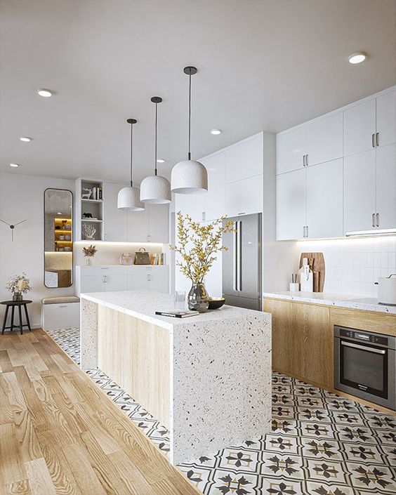 Apabila Anda ingin mempercantik dapur, kreasikan dapur dan lantai dengan memainkan pola tile atau dengan menggunakan tile dekoratif seperti mosaic sehingga tidak terlihat terlalu polos.